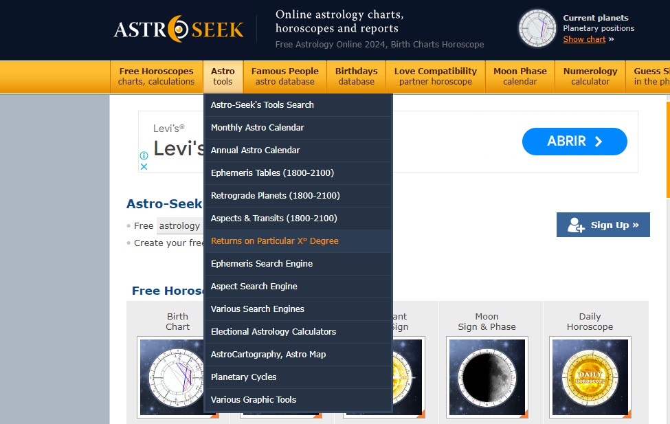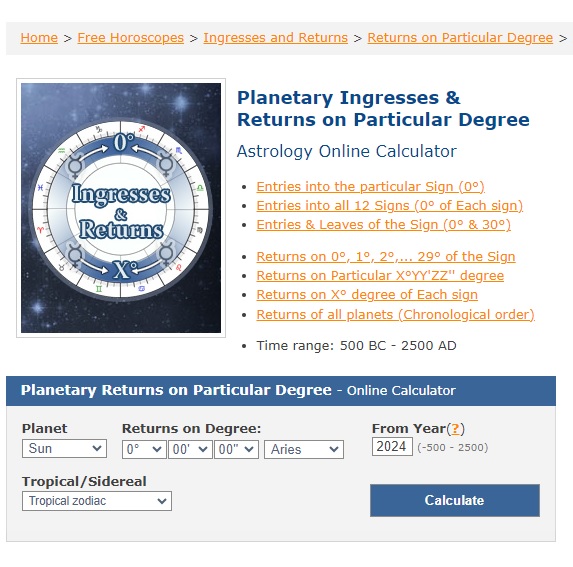 In “Astro tools,” click on “Returns on Particular X° Degree:”