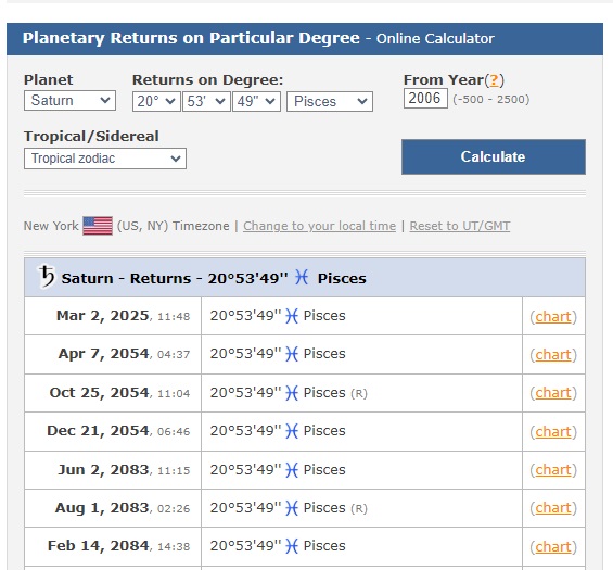 My client’s first exact Saturn return is on February 22nd, 2025, at 06:27 New York time.