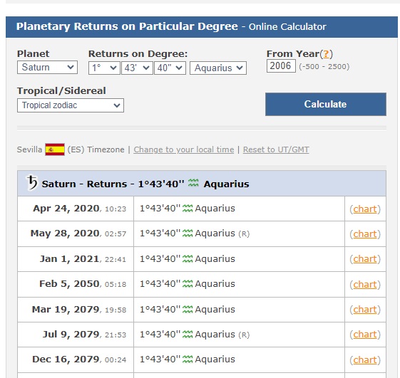 Once you know the degrees, minutes, and seconds Saturn is parked in your natal chart, you must go to astro-seek.com to calculate the exact return of this ringed planet.