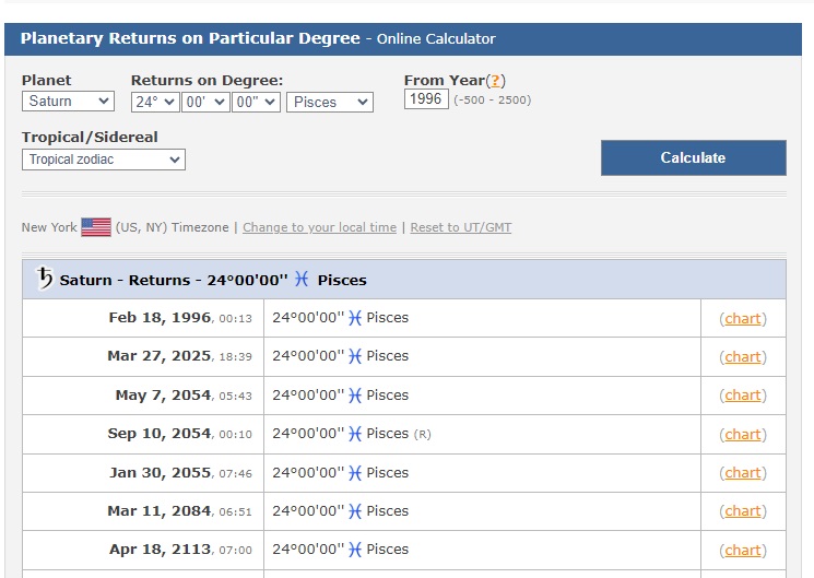 The date that is important here is March 27th, 2025. That’s when this person will start receiving clues about their first Saturn return. Saturn will be at 24 degrees of Pisces on that date. And 24 degrees of Pisces is the 10 degrees before the natal Saturn of this person.